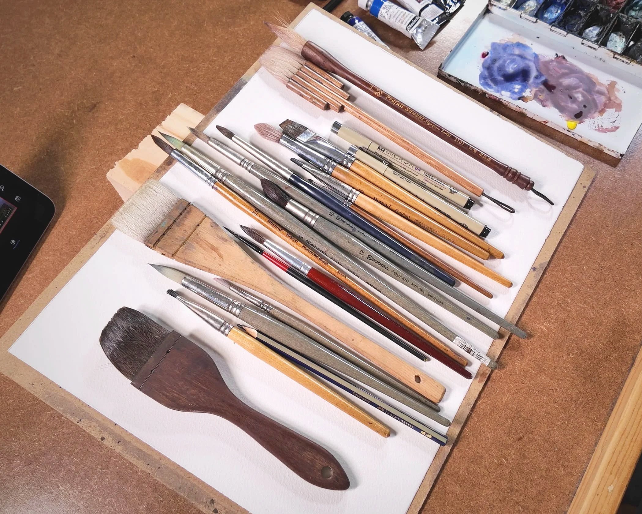 En mi estuche de trabajo utilizo pinceles de diferentes tipos de pelo, tanto natural como sintético, aunque tengo una preferencia clara por los pinceles de pelo sintético por su versatilidad y control.